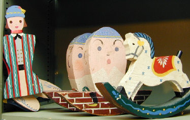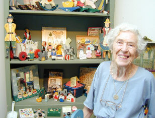 During World War II, almost all metals were held from toy manufacturers since they were critical to the war effort. Wood was just about the only medium available for toy making. At this time, Henry and Jane Schlosser, in 1943, started their Bonnie Barn Toy Co. in Roslyn, New York. Henry was a German immigrant who had been detained by US authorities for about 9 months at the entry of the United States into the war. Henry and Jane's wartime romance is told in the book "Love Stories of World War II" by Larry King. I met with Jane Schlosser in June of 2002 at her antique toy shop, Toys of Another Day, in the Stoudtburg Village in Adamstown, Pennsylvania. She has had a life long interest in toys that goes back to her days with her husband and the Bonnie Barn Toy Company. There, in her shop in Stoudtburg Village, was her personal collection of Bonnie Barn toys. I photographed many of the very simple but beautiful and artistically done wooden horses, jumping jacks, circus performers, and other characters. They reflect the toy artistry of Henry and Jane Schlosser. The wood used in most of these toys came from discarded scraps from ammunition crates made during the war. Enjoy seeing these beautiful toys: