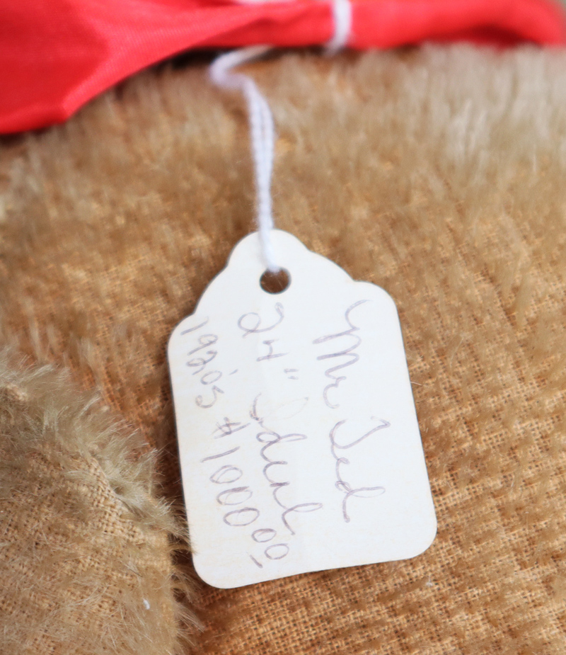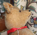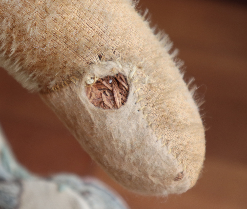 Straw stuffed bear - appraised as made by Ideal Early 1900s Mohair loss all over but still clean looking. Arms articulate - legs do not. $500 |