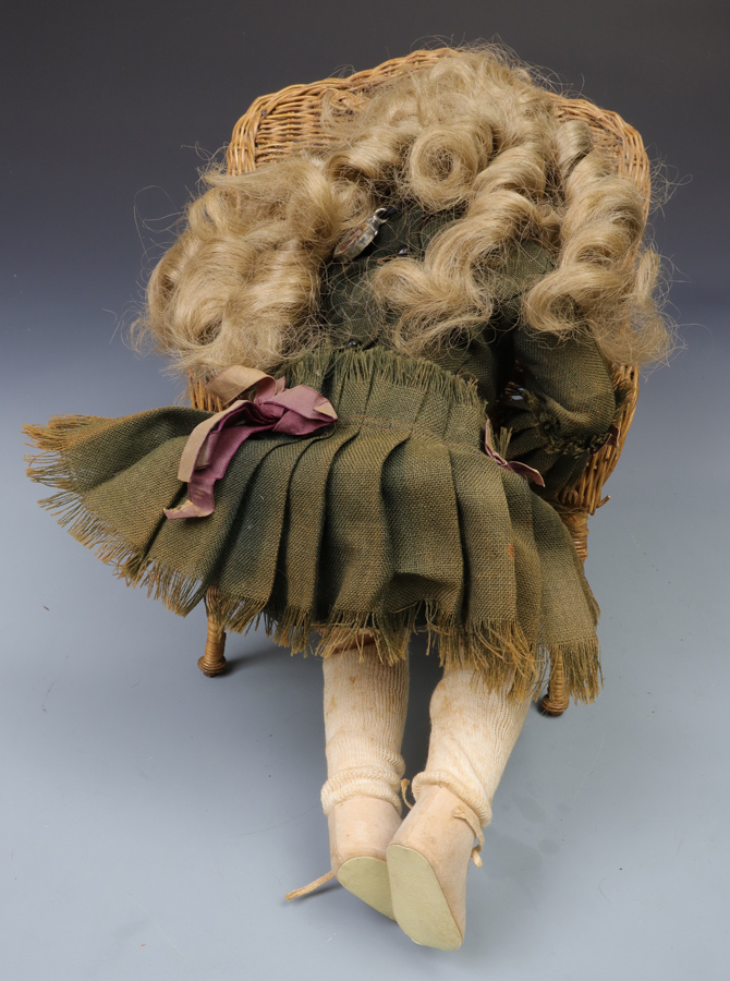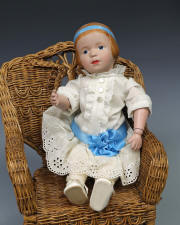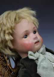 | TD19-D | Appears to me to be a 300 series doll, possibly a 14/ 312. 15 inches tall. Original wig. All joints are sound. Face in fair condition with cracks. Eyebrows repainted. Dress, shoes and undergarments are modern. $240 Sold |