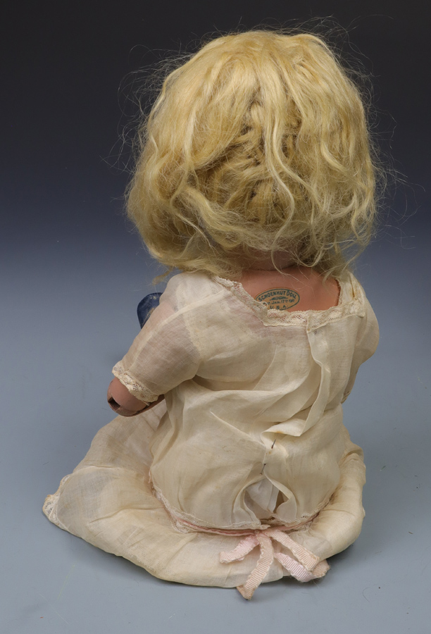 | TD19-U | Girl doll - 17 inches. Sleep eyes work . Appears to be original paint but in poor condition. Replaced wig. New dress Might be original shoes but with replaced soles. Decal on back. $100 Sold |