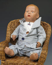 | TD19-Q | Little boy doll - 11 1/2 inches tall. Looks like an old repaint over entire head. New, nice suit. Mechanically sound. $80 Sold |