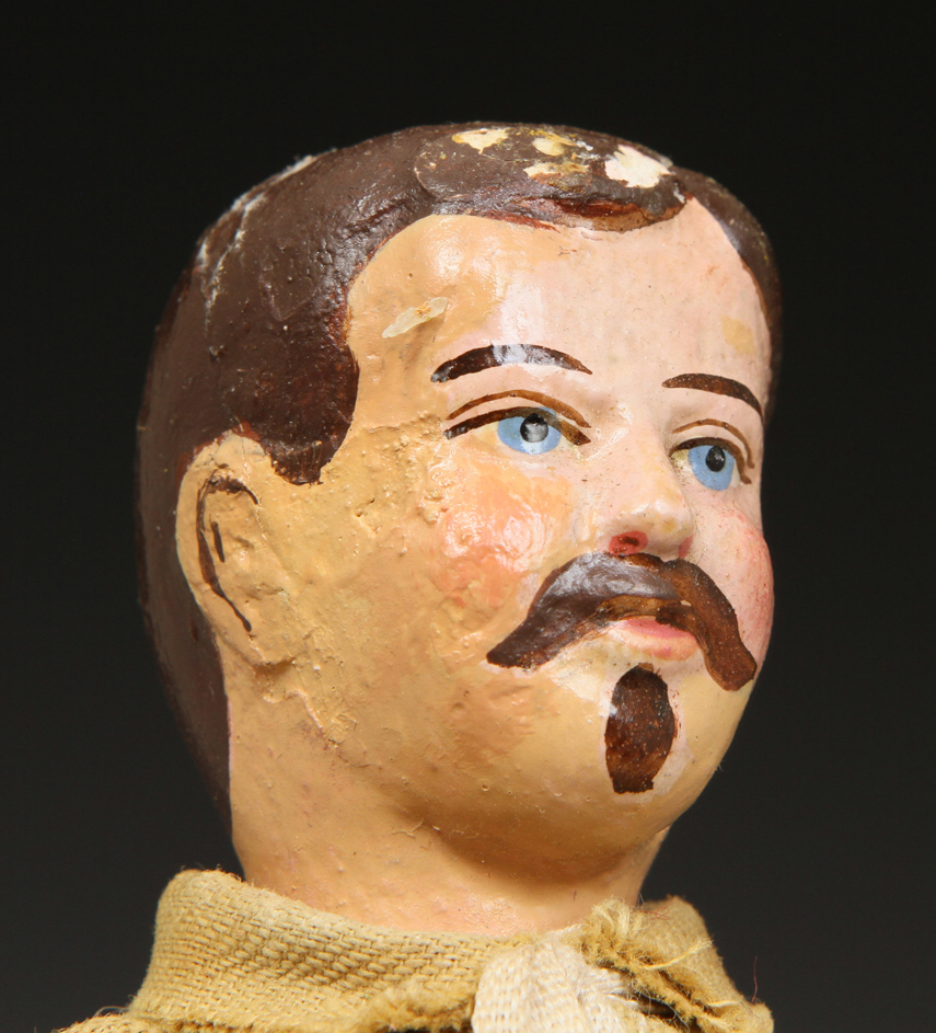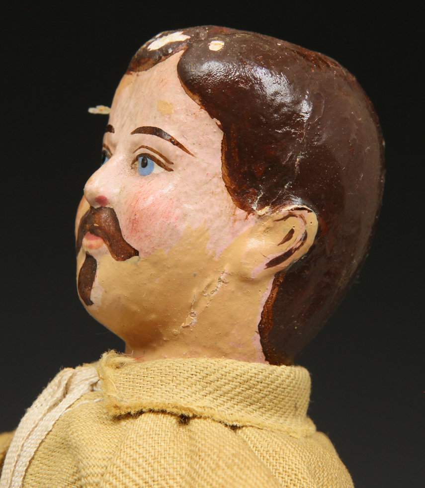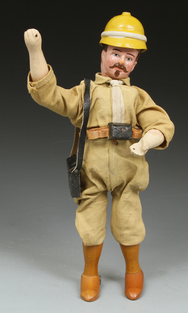 | TR09 | Teddy Roosevelt Hunter - in excellent condition except for head. Over paint around face and some on hair. Eyes, nose, mustache, and goatee original. See pictures at right. His suit is very sound. Original helmet. Sold |