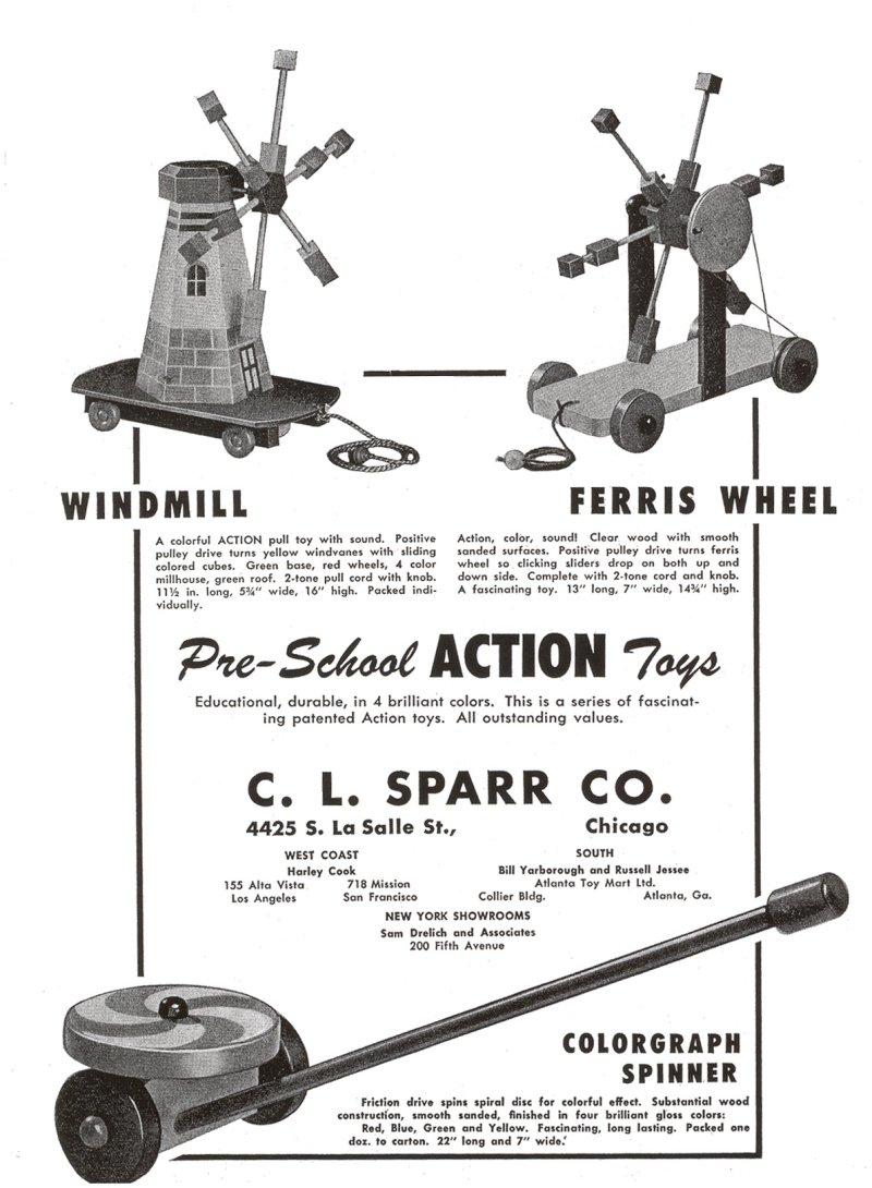 ![]() 1945 Advertisement Windmill: $120 - $160 Ferris Wheel: $60 - $80 Spinner: $30 - $40 |