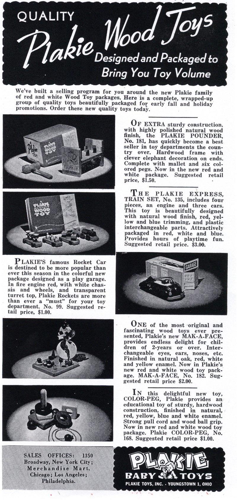 | Plakie Toys, Inc. A.K.A. Plakie Baby Toys Youngstown, Ohio Estimated 1944 - 1960 Plakie Toys produced plastic and wood toys that were advertised “with tested appeal.” We were able to find reference to Plakie Toys from 1944 – 1956. |