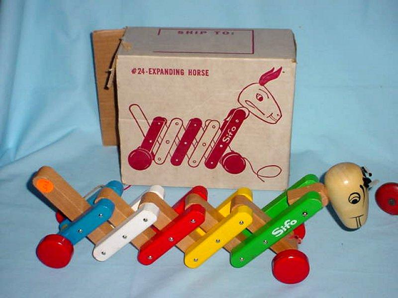 | Sifo Company A.K.A. The Sifo Novelty Company Norway, Michigan St. Paul, Minnesota 1944 - 1975 Sifo toys were designed to help children build their bodies by simple exercise, their minds through solving simple problems and providing necessary recreation, their motor and mechanical skills through trial and error, repetition and use of memory. They advertised that their wood was cut and sawed in their Norway, Michigan plant which was then sent to St. Paul to be finished. Sifo produced several different pull toys. The good news is that they are always marked with the Sifo name. We have included only a fraction of their toys for reference. |
