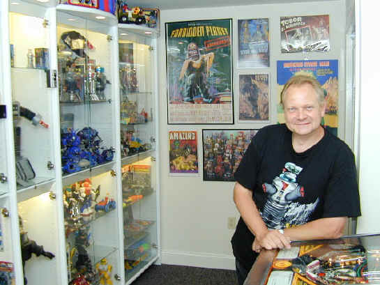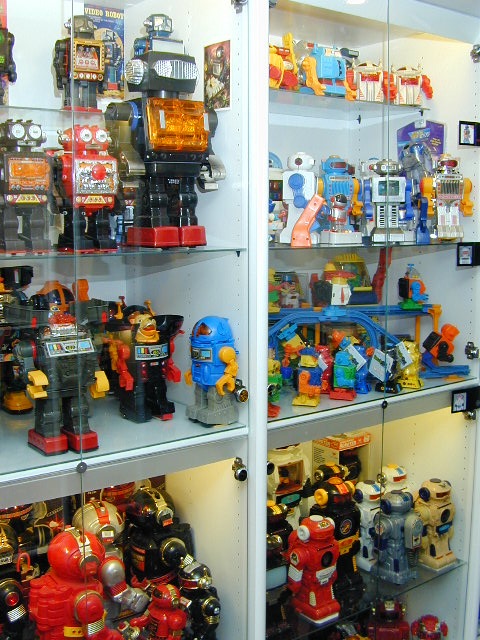 The Toy Robot Museum is located in Adamstown, Pennsylvania and is owned and operated by Joe Knedlhans. Robots, and consequently, robot toys are largely modern inventions. They are usually constructed on lithographed metal or plastic and made between 1950 and the present. However, at the robot museum, Joe showed me an early wooden robot from the Jolin Company of Appleton, Wisconsin. This robot is rare and is shown here along with photographs of Joe and his unique Toy Robot Museum. |