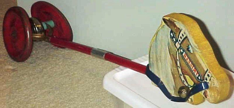 stick toys and pony stick toys made by Gong Bell in the 1930's to 1950's